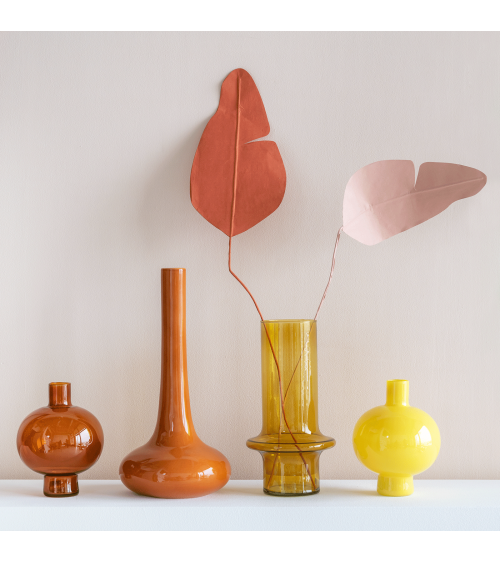 Composer de petits bouquets de renoncules, jonquilles, narcisses, nos fleurs de printemps, avec ce vase en verre recyclé ambre transparent.